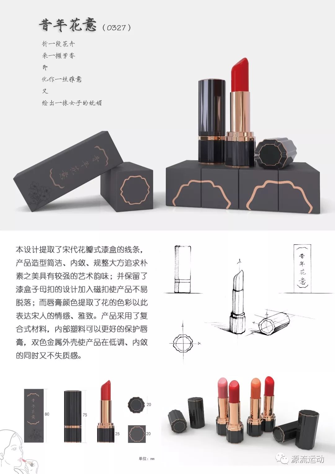 本设计提取了宋代花瓣式漆盒的线条,产品造型简洁、内敛、规整大方,追求朴素之美,具有较强的艺术韵味;并保留了漆盒子母扣的设计,加入磁扣使产品不易脱落;而唇膏颜色提取了花的色彩,以此表达宋人的情感、雅致。产品采用了复合式材料,内部塑料可有效保护唇膏,双色金属外壳使产品在低调、内敛的同时又不失质感。