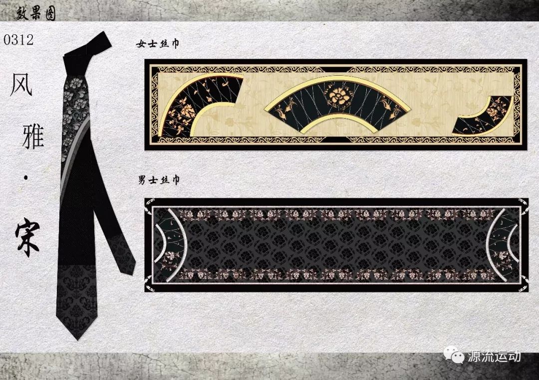灵感来源是宋代磁州窑瓷器,图案元素是瓷器花纹。领带采用黑灰,加入暗纹元素显得尊贵的感觉。男士丝巾在色彩方面黑色、白色加点点红色挥去黑白元素的死板,沉闷,还暗加了底纹,显得更加稳重成熟。边框四个角暗加花纹,前后呼应。女士丝巾黑色、米色加点红色,显得优雅大气。在对称和均衡法则里,重复,统一与调和法则里。多样统一重复规律在丝巾图案设计中,可以认为是组合图案的各元素之间一定存在的共同结构和内在联系。