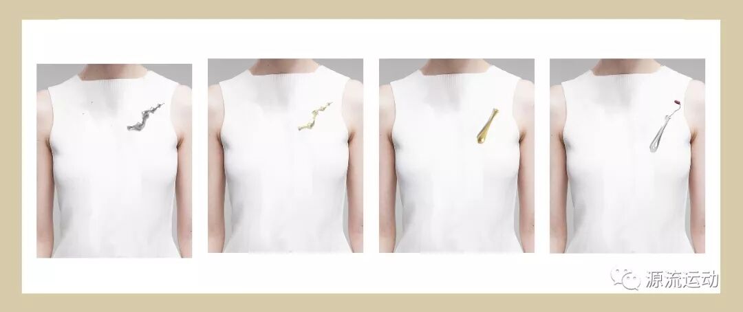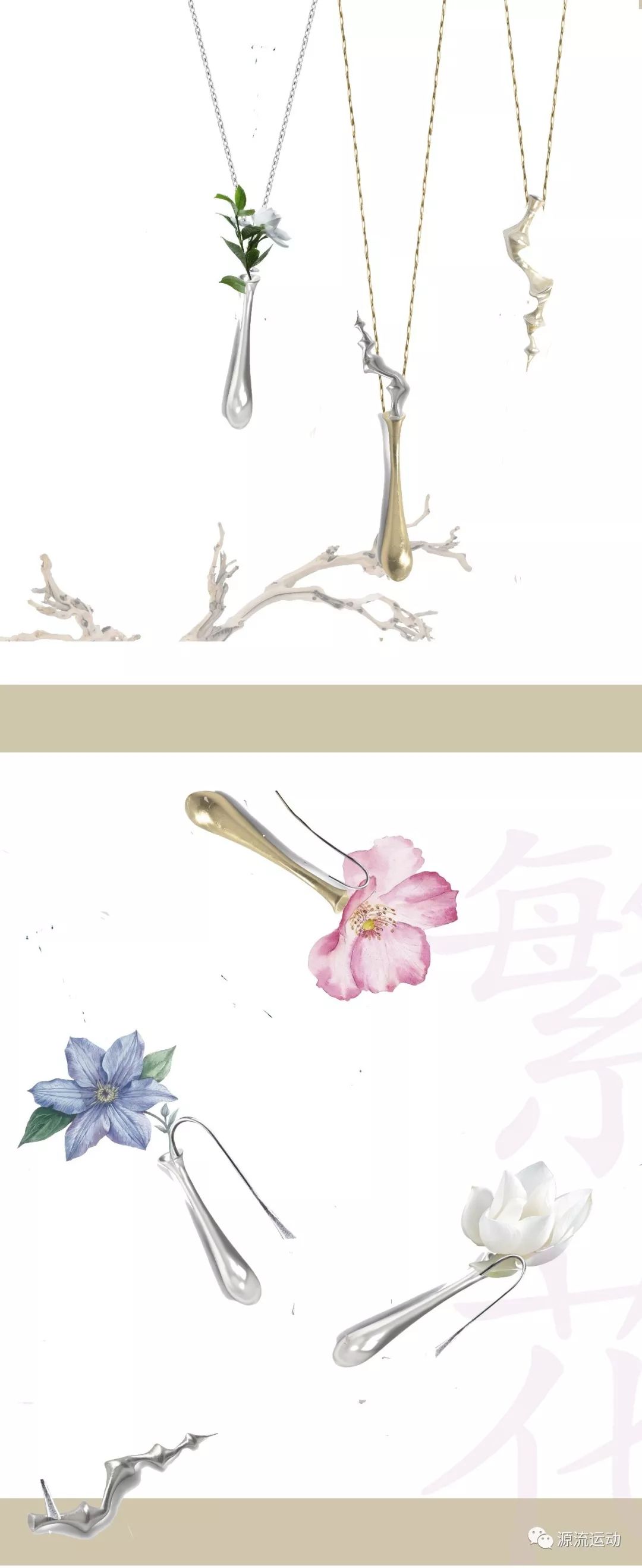 灵感来自于宋代插花的器与艺,“小瓶”组瘦长的形态脱胎于胆瓶修颈、垂腹的器型,又将插花容枝的功能承继,佩戴者可插小花于瓶中,感受宋人“小瓶贮芳条,花落砚池香”的清风雅韵。“芳条”组则直接将花瓶变作斜枝芳条,“插花瓶”化作“瓶中枝”,以“清”为精神所在,以“疏”为意念之托,可谓是对花艺中追求的“理念花”最精巧的现代演绎与哲思重现。