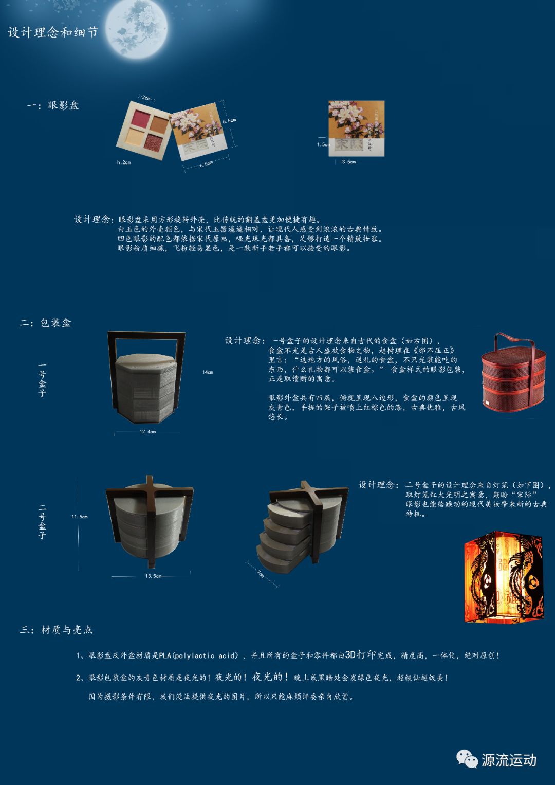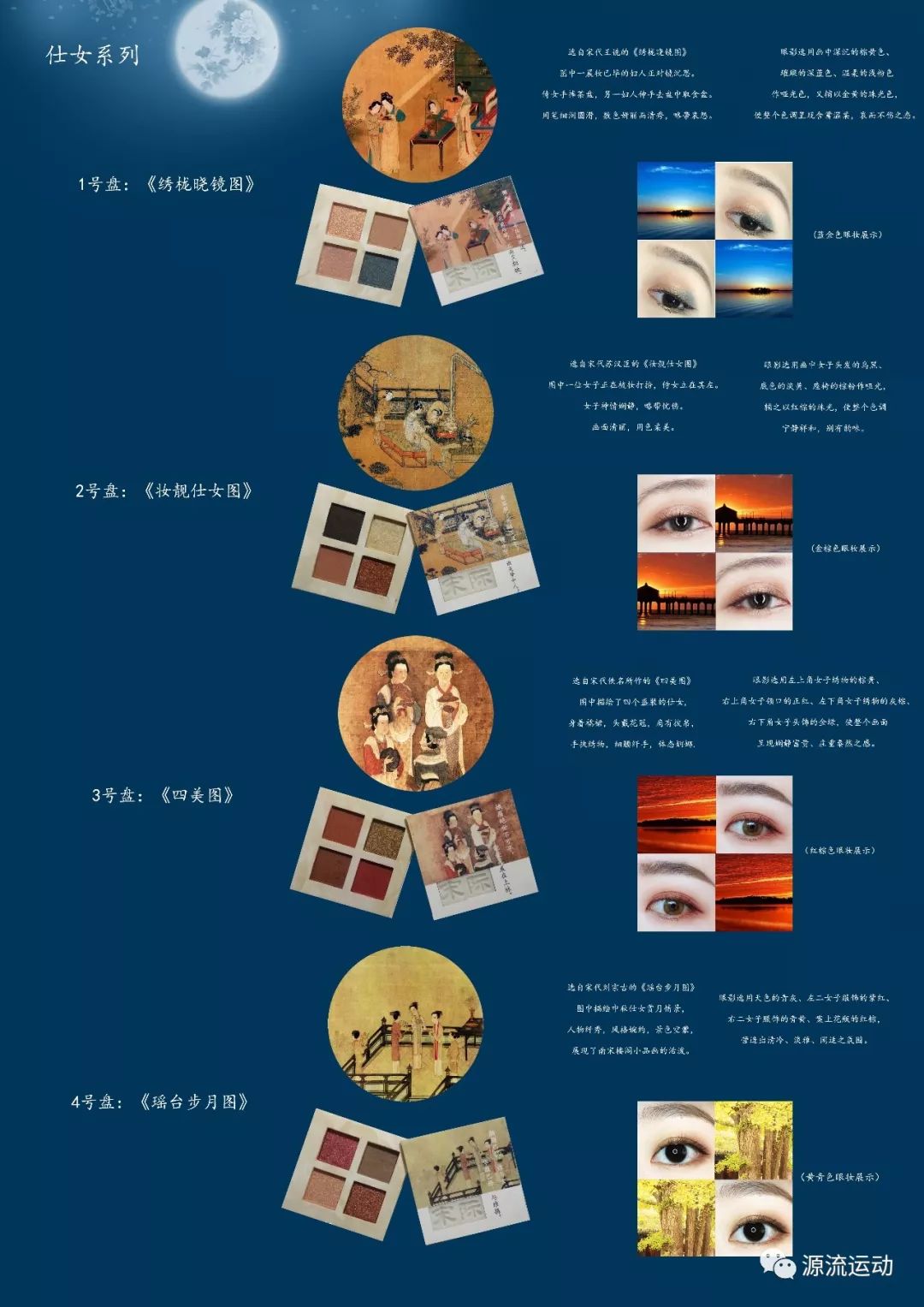 此次眼影共有两个系列,分别是仕女系列和花鸟系列,每个系列由四个四色眼影构成,主题和配色都来自宋代绘画。每个系列的作品配备有外包装,分别是食盒和灯笼的造型,分别取馈赠和光明之意。