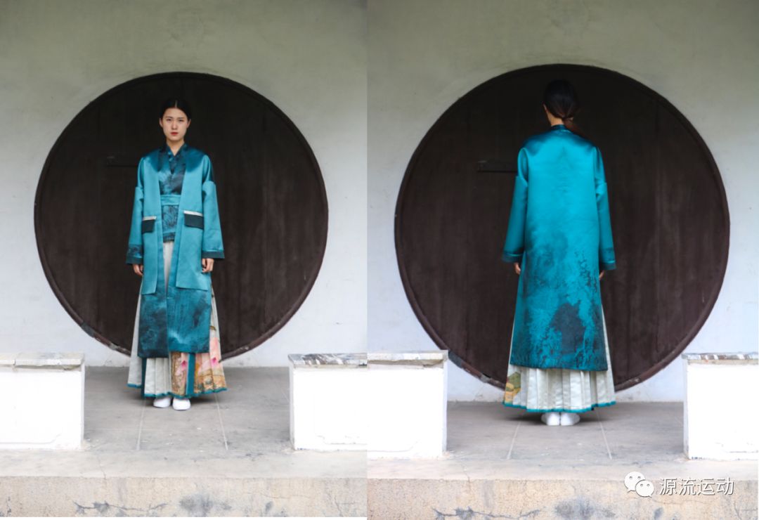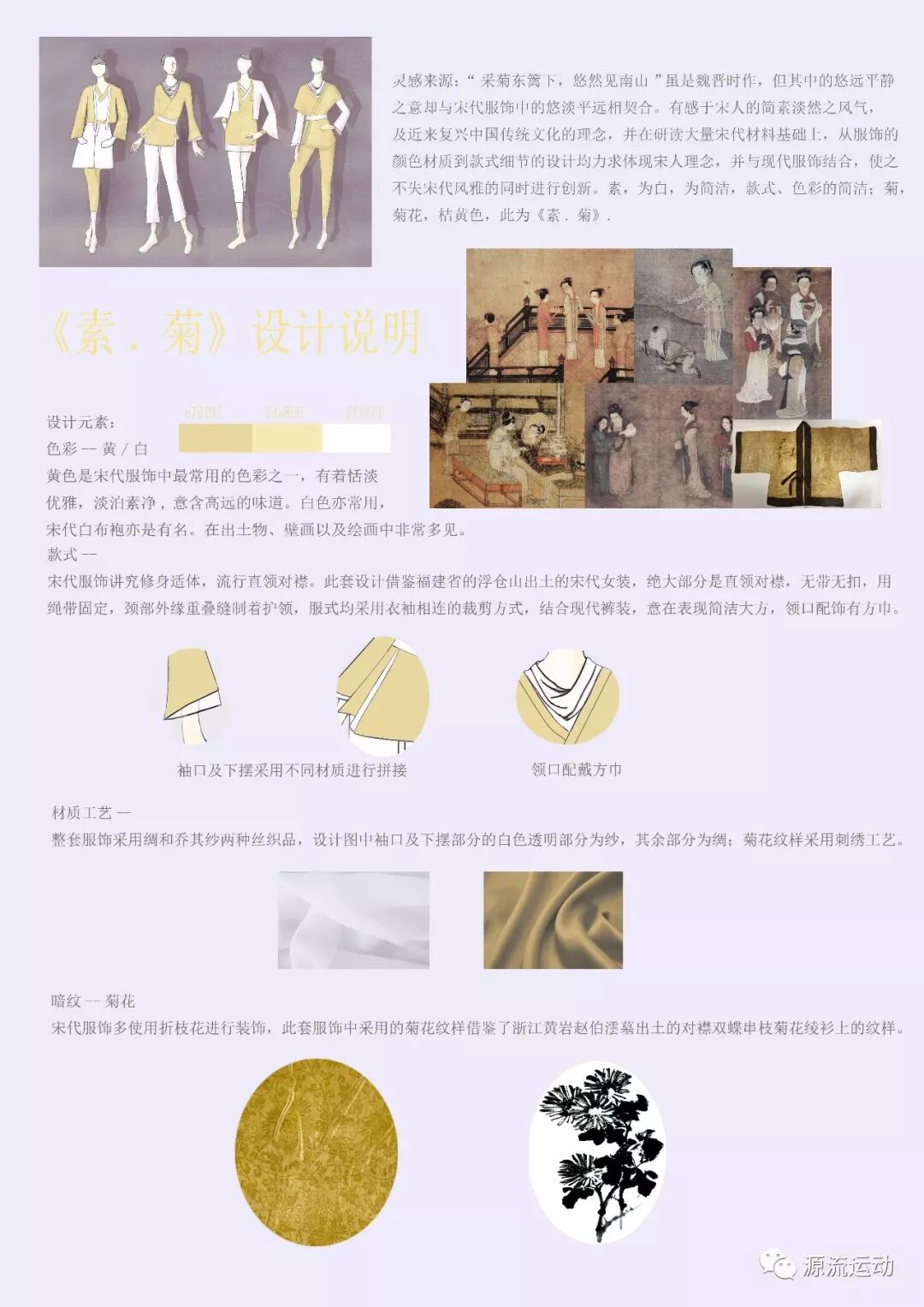采菊东篱下,悠然见南山”虽是魏晋时作,但其中的悠远平静之意却与宋代服饰中的悠淡平远相契合。有感于宋人的简素淡然之风气,及近来复兴中国传统文化的理念,并在研读大量宋代材料基础上,从服饰的颜色材质到款式细节的设计均从宋画和宋代实物中寻求灵感,并将其与现代服饰结合,使之不失宋代风雅的同时进行了创新。素,为白,为简洁,款式、色彩的简洁;菊,菊花,桔黄色,此为《素.菊》。