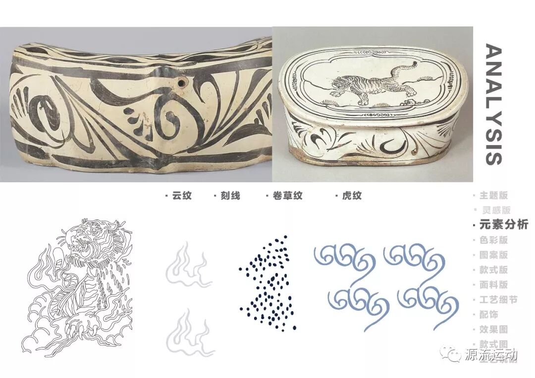 本系列设计灵感来源于北宋磁州窑系所产的虎纹瓷枕。白虎作为中国四大神兽之一,赋予着善良与智慧,象征现代年轻人既有温和的内在,又有虎勇猛的力量与执着追求梦想的勇气。整体风格运用磁州窑的白地黑花的刻划花技法。