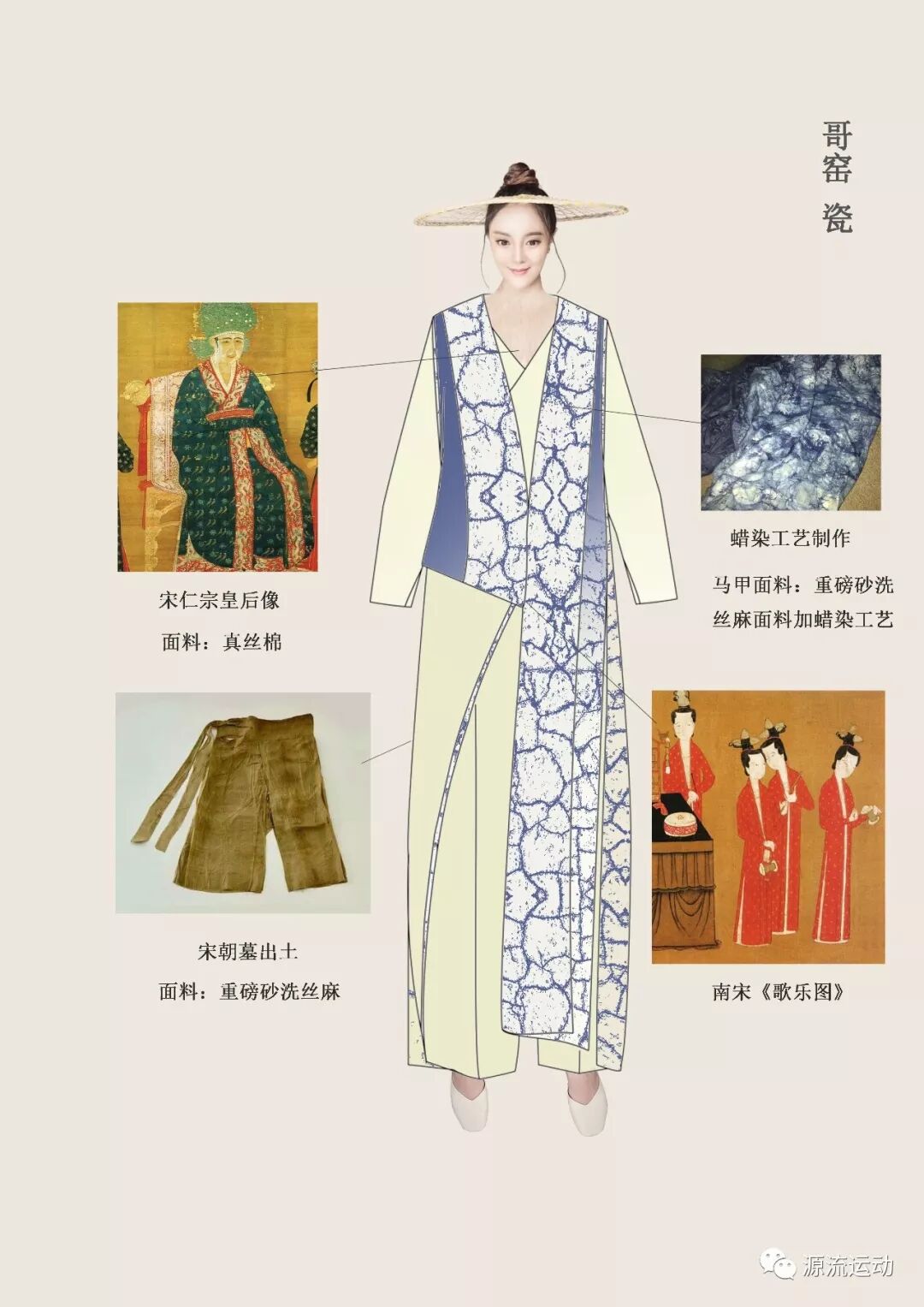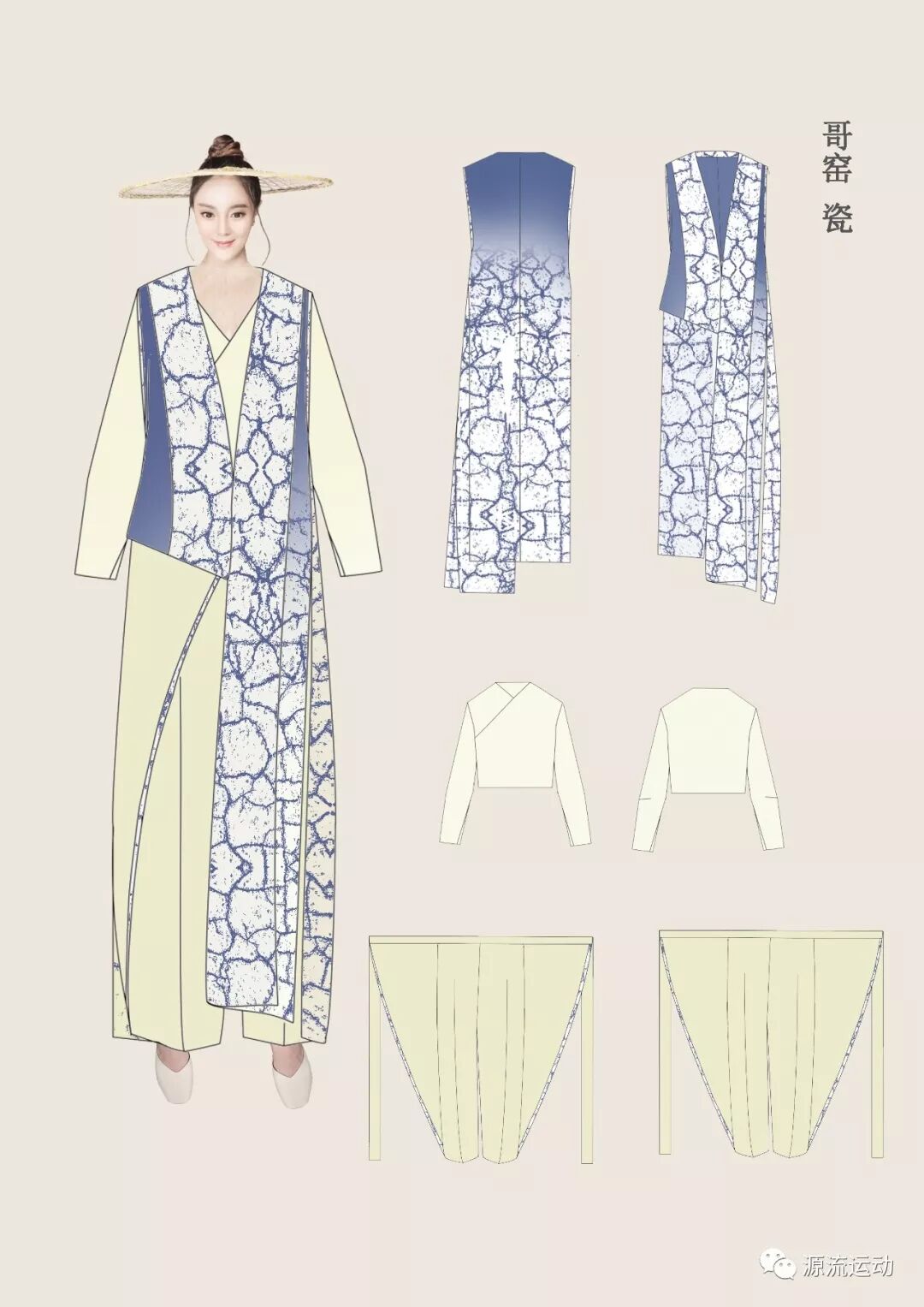 衣服的灵感是来自起源于宋朝的哥窑,哥窑的瓷器以其冰裂纹为名。蜡染在宋时也风靡一时。所以服装用了蜡染工艺来表现哥窑的冰裂纹。宋的服饰素雅,所以用到了黄蓝色。用了褙子的外形进行变款,打底者用了交领。裤子的设计则是改良了宋朝的开裆裤。以现代可以穿着的方式表现了。面料主要用到了丝麻。宋代的服饰以丝麻为主。瓷器与中国的英文相同。足以代表瓷器的发展在中国的地位。所以瓷器是中国历史文化传承不可或缺的。