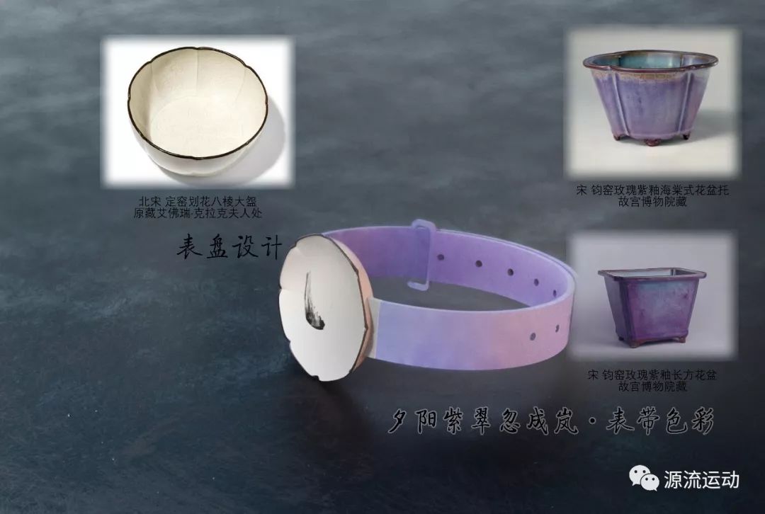 宋代瓷器在理学的影响下,体现出端方、简洁的特色,与当代推崇的极简主义设计不谋而合。本产品也避免繁杂的装饰,表盘部分采用定窑划花八棱大盌碗沿的元素,朴素简洁。表带部分使用 “夕阳紫翠忽成岚”的钧窑瓷器色彩,灵动美观,表带扣结合瓷器金缮工艺元素设计为金色祥云。表面使用墨水屏,以墨滴流动的形式指示时间,寄托“慢生活”的理念,这也体现在表的命名上:“何妨吟啸且徐行”。