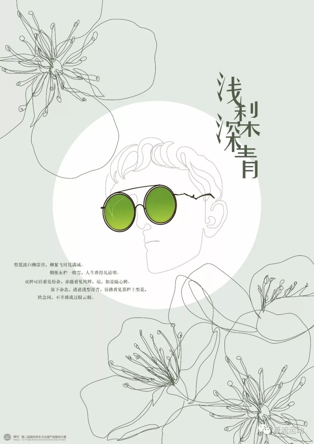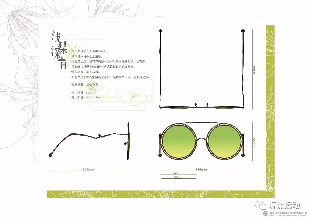 “梨花淡白柳深青,柳絮飞时花满城。惆怅东栏一株雪,人生看得几清明。”美好可以是一个人、一段往事、一株雪,也可以是一首诗、一段光阴、一朵盛开的梨花。 本作品以梨花之姿作为中心设计,选择墨镜亦有无惧光害且直视美好的景物之功用。双眸可以看见纷杂,亦能看见纯粹,且看观者的心态与情怀。利用诗文意境期望领佩戴者进入诗中意境,投射自身境遇并放下杂念,就仿佛看见那东栏上的梨花,转念间,所有的不幸都将成为过眼云烟。