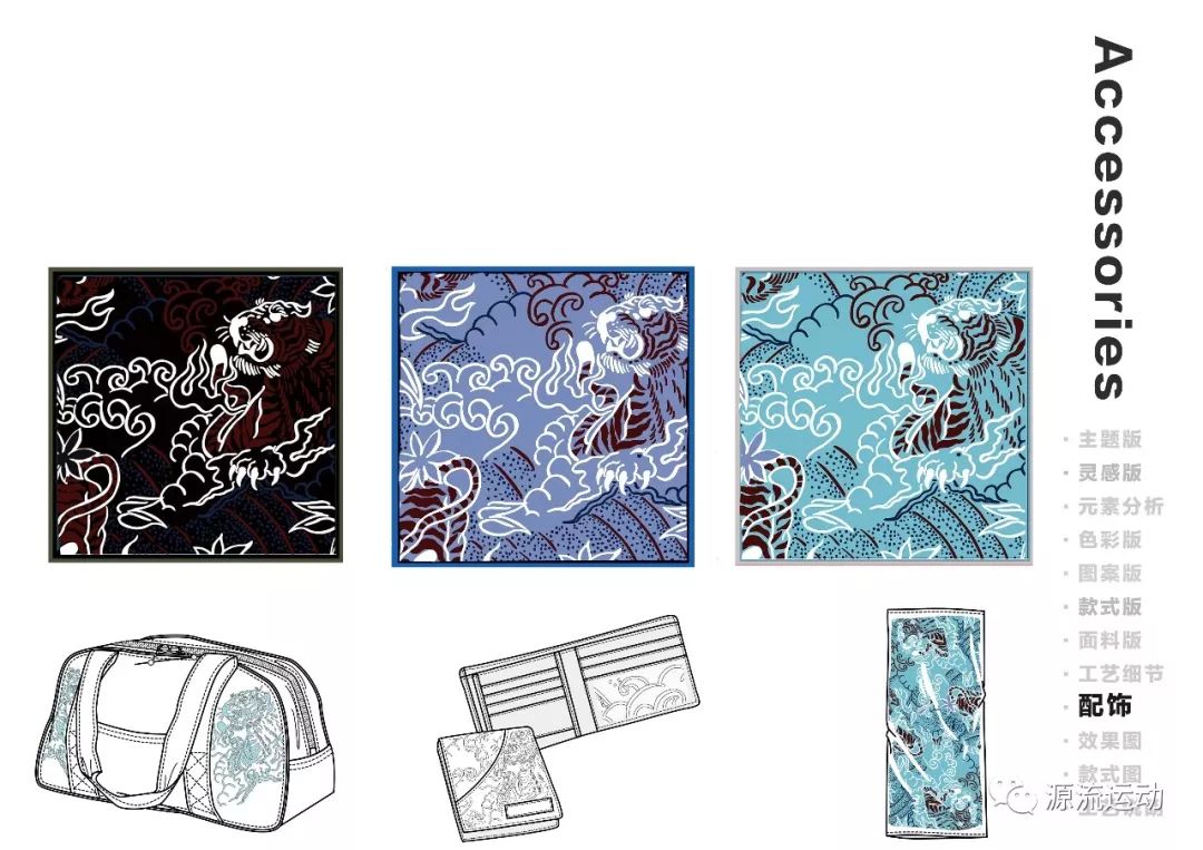 整体系列图案以虎纹为主,辅以云纹、卷草、刻划水滴等。采用绘画、手工刺绣等工艺表现,在袖口、口袋等细节部位运用传统的衍缝工艺;颜色以藏蓝、墨黑色系为主,表现现代人的宋式美学主张;面料采用棉麻、绸缎、牛仔等;造型设计上采用新中式结合时下流行廓形,庄重大方。款式设计上,注重符合人体穿着的功能性。