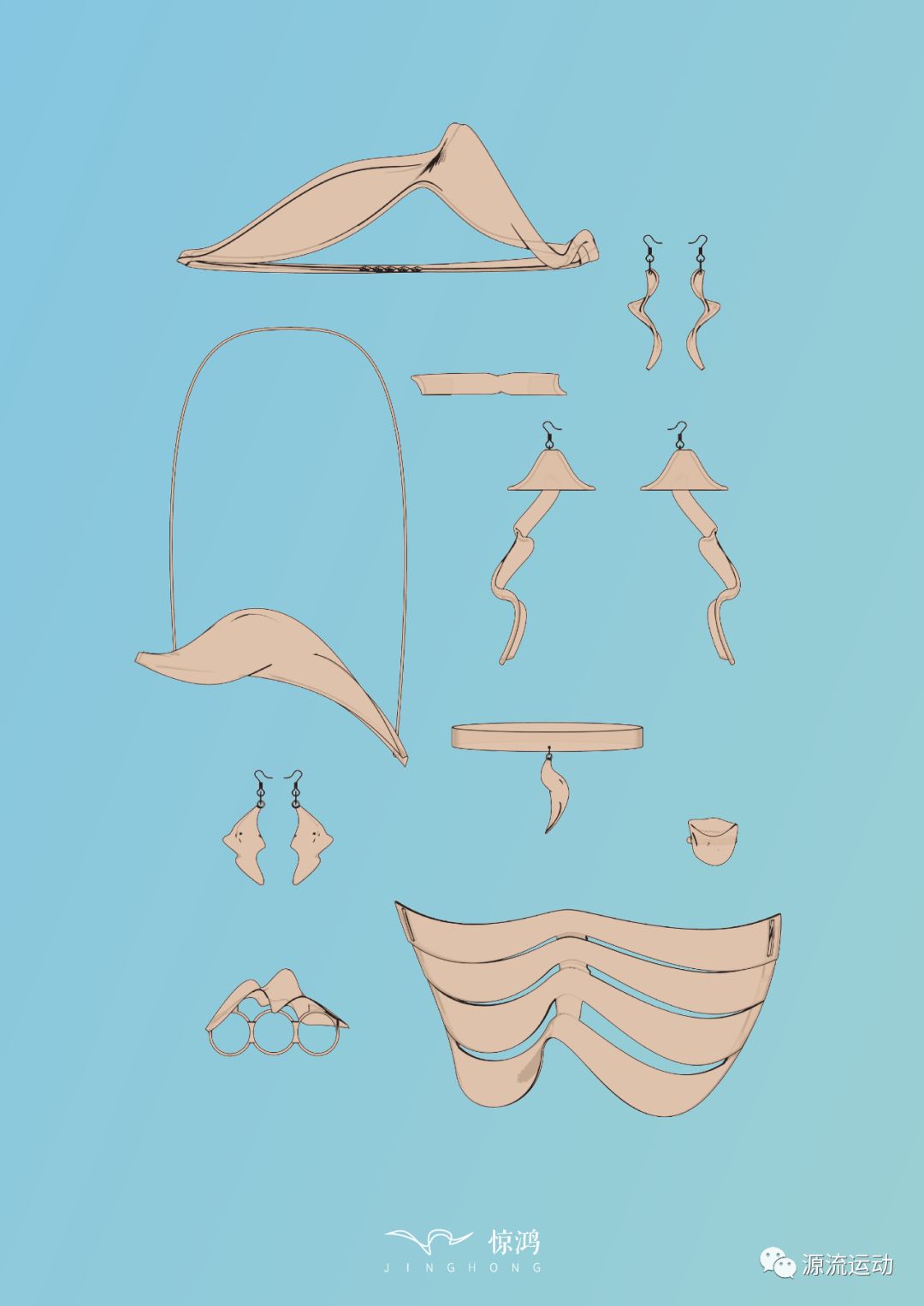 灵感源于宋词的词牌名,极具韵律感和美感。设计的初衷是想要转化这种抽象的美感,使之成为同样具有美感的视觉、听觉或触觉体验。选取了【声声慢】【钗头凤】【雨霖铃】【苏幕遮】【一剪梅】这五个词牌名,经过汉字,图形,形态的层层转化,制作了面具、耳坠、项链等多样品类的首饰与配饰。我设计“惊鸿”系列的初心就是想把中国传统文化进行重新演绎,让年轻人不会觉得这些有几千年历史的文化瑰宝是陈旧迂腐的,它们可以在保留原有含义的同时依然很现代,很时尚。