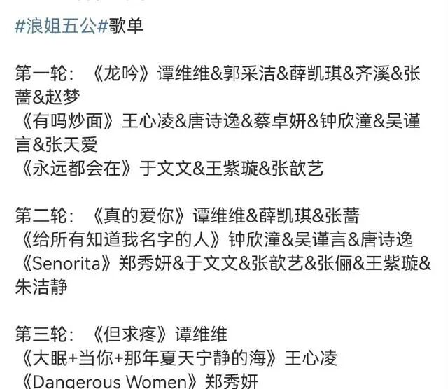 这就使得这一季的姐姐虽然自带话题度,但一直没有机会发挥自己的实力,不过目前已经录制结束的五公却广受好评,由于节目是录播分离的形式,五公早已录制结束,淘汰名单和选曲等已经新鲜出炉。