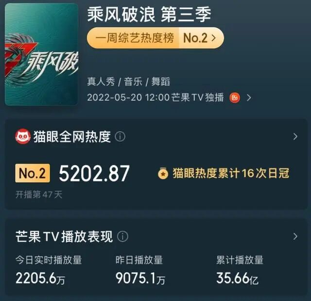这一季的《浪姐》虽然争议不断,但数据表现依然十分出色,上线后累计拿下热度排行榜的16次日冠,播放量也达到了35.66亿。
