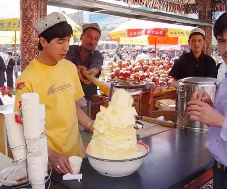 伊犁大大小小的巴扎上,总有那么一个冷饮摊冰激凌高高堆在大盆子里。伊犁手工冰淇淋,奶香浓厚醇香,但口味清爽一点也不腻,鲜美到地球炸裂,完虐任何品牌的冰淇淋!