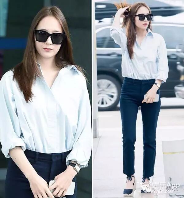 Krystal的一身是十分简单的黑白搭配,白色的衬衫搭配黑色的牛仔裤,鞋子是十分小清新的坡跟草鞋。整身看上去虽然没有多出彩,但十分大方得体。