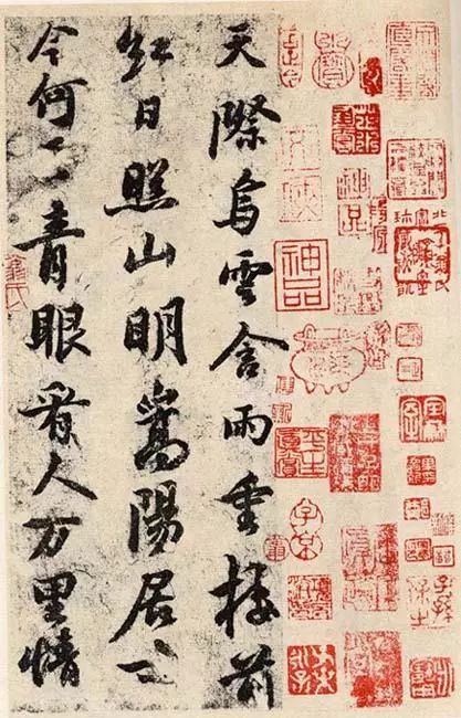 纵览全篇,字态凝重而饶有韵致,笔画圆浑朴茂,一点一画恰具有力屈万夫之力度。如果从用笔上去推究,苏字很大程度上得力于颜真卿的笔法,落笔沉着,行笔涩进,提按转折凝重,故线条圆润丰实而富有内涵。据载,苏东坡『少时规摹徐会稽,笔圆而姿媚有余;中年喜临写颜尚书,真行造次为之,便欲穷本;晚乃喜学李北海,其豪劲多似之』(黄庭坚《山谷集》)。《天际乌云帖》明显地留有颜字的遗痕,这是苏氏中年临写颜字的自然流露。