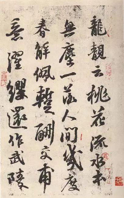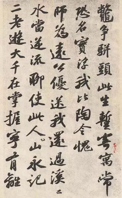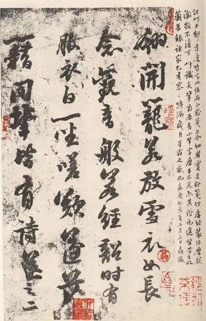 他屡屡自道『我书意造本无法,点画信手烦推求气强烈地抒发了一种不为绳缚,崇尚自我和自然的艺术情感。欣赏此帖,能感受到作者从头至尾都处于一个心手双畅,兴到笔随的精神状态。字势的映带关联,字态的率意洒脱,字列的大小错落,都营造出一种顺乎自然的艺术情景。