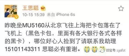 早在2015年,王思聪就发布微博称自己丢失了卡包,里面有各大银行黑卡。还哭脸求拾到者归还,思聪必有重谢,可见这黑卡对于王思聪有多重要了。