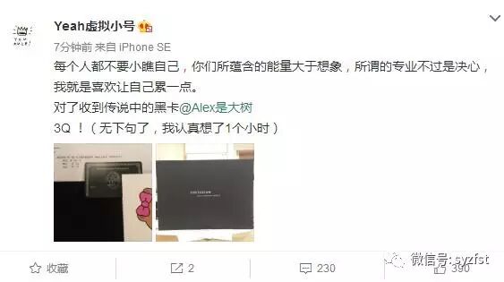 要说最近微博上最火的一个账号应该就是郑爽的小号“Yeah虚拟小号”了,虽然人家既不是红V,也没有认证,但是就是随便写几个字儿就大火。超越了所有的大V和网红。不服也不行。不过,要说郑爽微博的文风也确实是够洒脱的,有时深沉的一塌糊涂,有时候又活泼的如同小精灵,总之就是变幻莫测。但无论如何,郑爽都是一个真性情的女孩。3月5日晚,沉寂了几天的郑爽没忍住,又发了一条微博,这次,郑爽晒出了一张黑卡。