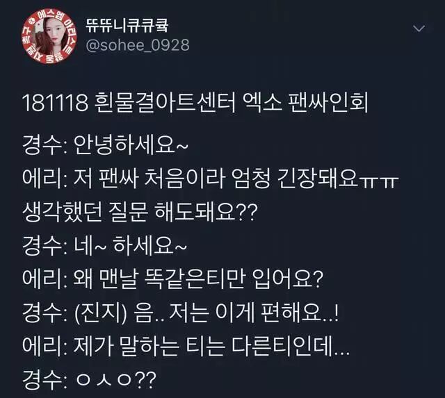 想说D.O.会像Jennie那样问「是哪一件Tee」的女粉丝,得到了最平凡、最正常的答案,让她一时不知所措,连D.O.也露出惊讶的反应呢~后记分享出来后,粉丝们笑说D.O.果然很真挚地回答粉丝的问题,完全没想到是撩人的句子啦!