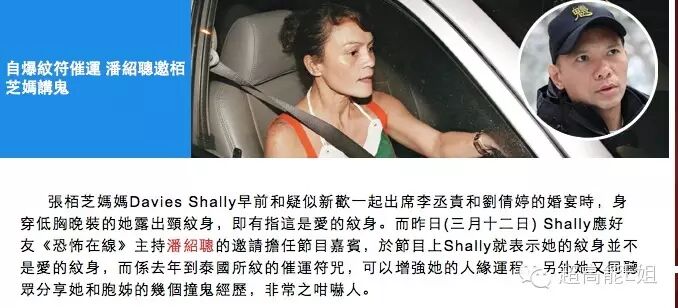 张柏芝的妈妈戴莎莉也是香港灵异节目粉丝,近期还担任《恐怖在线》节目嘉宾,大谈自己在泰国求得的“催运纹身”及撞鬼经历。