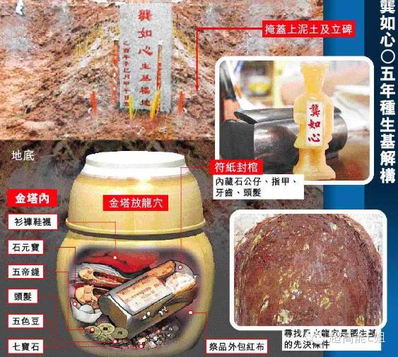 道家法术,即为活人立墓碑,把活人衣物或毛发等埋入“龙穴”,做成生冢祭拜,用以改运、延寿或求子,香港及内地富豪、明星均热衷于此。