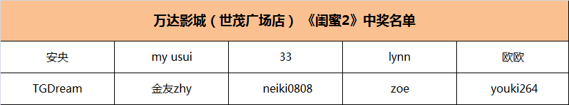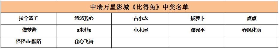 最后附上《闺蜜2》、《比得兔》中奖名单,中奖私信已发送,请及时兑奖哟~