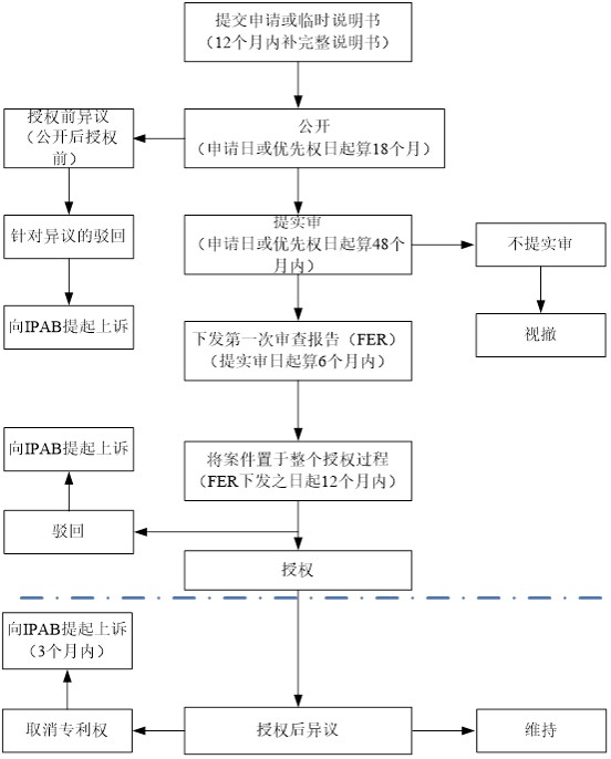 下图的蓝色虚线以上部分,示出了印度专利申请的大体流程,基本上经历:提交申请 → 形式审查通过后于申请日(或最早的优先权日)起十八个月公开(在公开之日起六个月内,申请未被授权前可以提起授权前异议) → 自专利申请提交日(或最早的优先权日)起48个月内提出专利申请的审查请求 → 审查部门对于专利申请进行实质审查,并发出第一次审查报告;审查流程主要包括:(a)形式审查和检索,(b)实质审查,(c)申请人答复,(d)再次审查,(e)做出最终决定(如驳回或授权决定)等内容 → 对决定(如驳回决定)不服的可自收到驳回决定之日起3个月内向印度知识产权申诉委员会提出上诉。