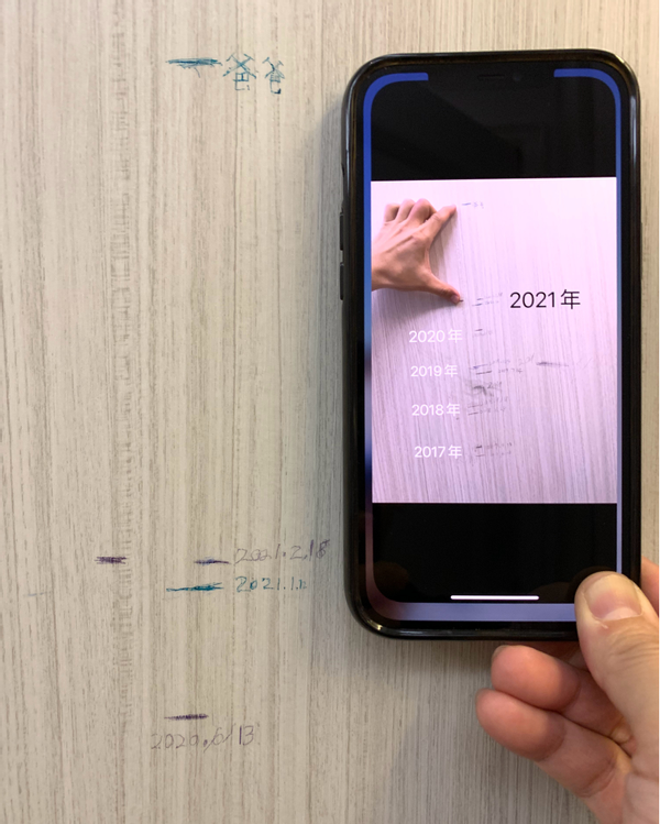 第二张是爸爸量完身高后,Kimi在刻度处用左手写上“爸爸”二字,因为是左撇子,所以小小志的握笔姿势看起来就特别奇怪。