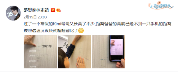 2月19日深夜,林志颖开心发文称,过了一个寒假的Kimi哥哥又长高了不少。