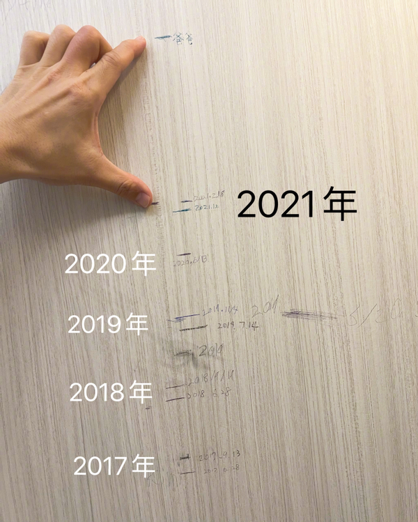 首张照片是一张身高墙,记录了Kimi从2017年开始的身高,没有详细的身高数据,只有一个目标——爸爸。