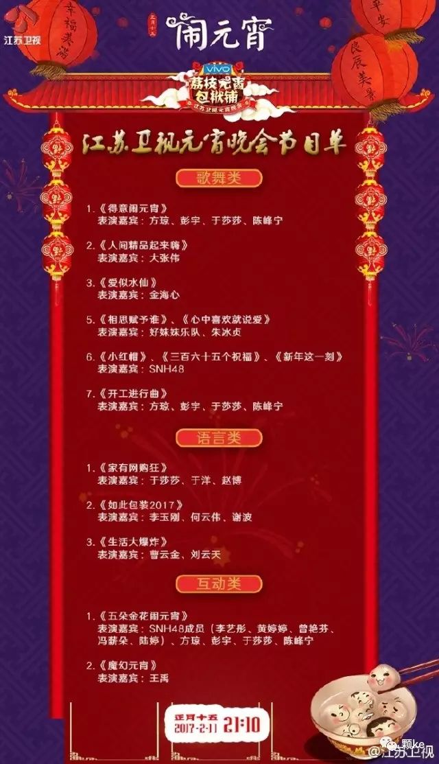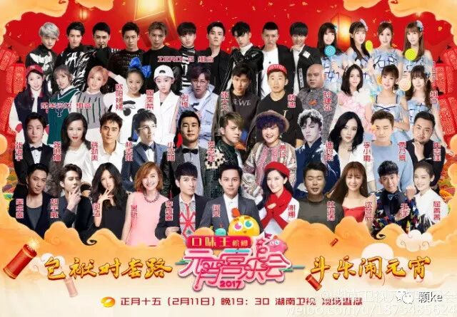 与春晚一样,央视的元宵晚会将在2017年2月11日(正月十五)的晚八点进行,虽然调皮的央视还没有正式公布节目单,但是“cctv微视”透露出的几位大红卡司还是成功的在网络上引起了热议。