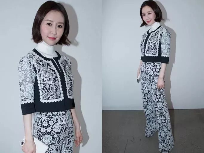 舒畅这身Tadashi Shoji黑底白色蕾丝套装,内搭白色高领短袖上衣,衬得皮肤越发白皙,胸前蕾丝花纹精巧又别致。