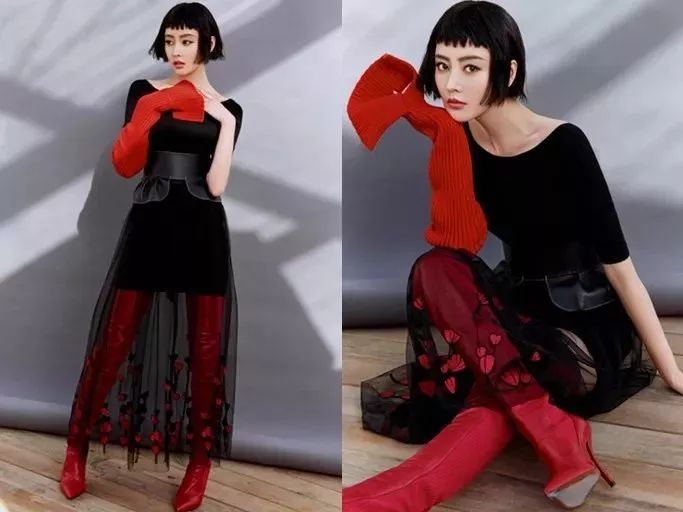 蓝盈莹在日前拍的大片中身着红色纱质长裙,点缀闪烁的亮片蕾丝尤为吸睛,V状剪裁的领口一层蕾丝覆过,肌肤若隐若现尽显复古高贵感觉,缎面蝴蝶结束腰装饰,打造视觉层次感的同时也凸显了其姣好身材比例,搭配功力令人惊叹。