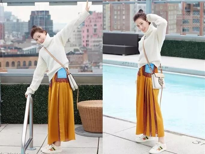 刘诗诗则巧妙地用姜黄色蕾丝吊带长裙外搭白色高领毛衣,经典荷叶边小白鞋,使造型甜美又不失个性。