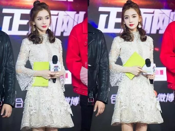 身穿Elie Saab高定镂空蕾丝短礼裙的Angelababy高贵优雅,搭配红色闪钻点缀的裸色系高跟鞋,清爽的半丸子公主头散落颈间,耳环若隐若现地点缀于发间活泼灵动,仙气十足。