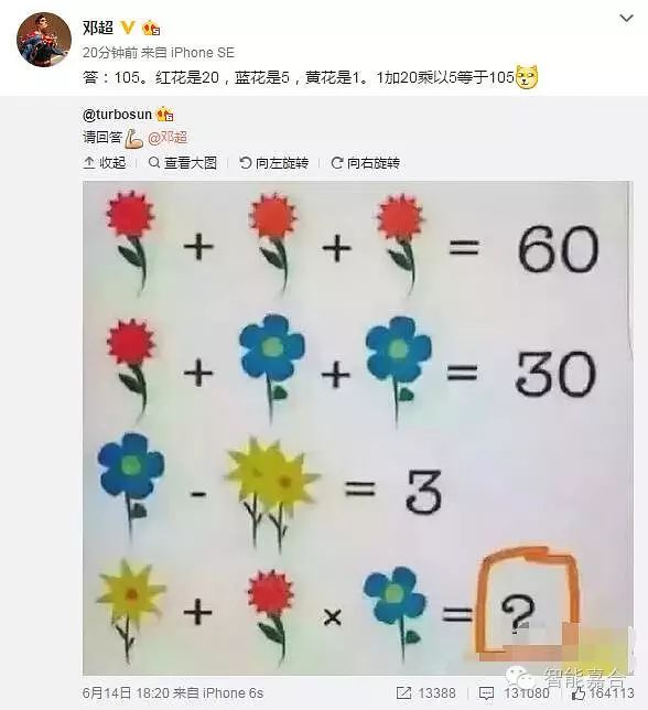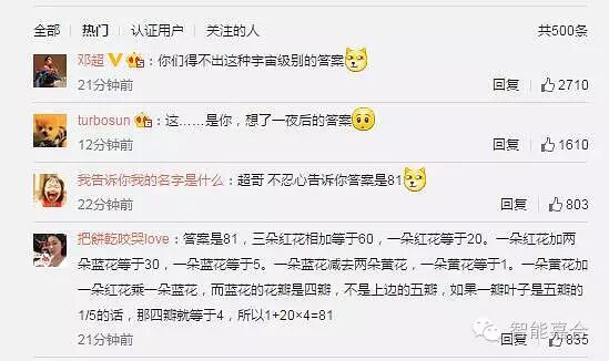 有网友在微博下评论,把正确答案和解释贴给了邓超:“答案是81,三朵红花相加等于60,一朵红花等于20。一朵红花加两朵蓝花等于30,一朵蓝花等于5。一朵蓝花减去两朵黄花,一朵黄花等于1。一朵黄花加一朵红花乘一朵蓝花,而蓝花的花瓣是四瓣,不是上边的五瓣,如果一瓣叶子是五瓣的1/5的话,那四瓣就等于4,所以1+20×4=81”。