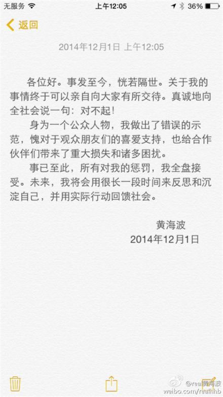 今天凌晨,黄海波获释后首发声明:做了错误示范