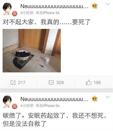 一则想不开的新闻:昨日,一名四川网友连发多条微博,并配发安眠药、炭火盆图片,疑似正在自杀。该网友在微博上说,他跟一女子网恋一星期,女子觉得两人不合适要分手。截至昨天下午6点,微博被网友评论2万多条。当晚四川泸州警方证实,自杀男子经抢救无效死亡。
