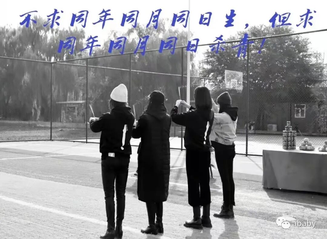 姚晨身穿蓝色牛仔外套,头戴针织帽,站在最右侧,其他三人依次为庄达菲、代乐乐、赵子琪,她们共同手中把香,一起望向天空。图片中配文字“不求同年同月同日生,但求同年同月同日杀青!”看起来十分俏皮可爱。