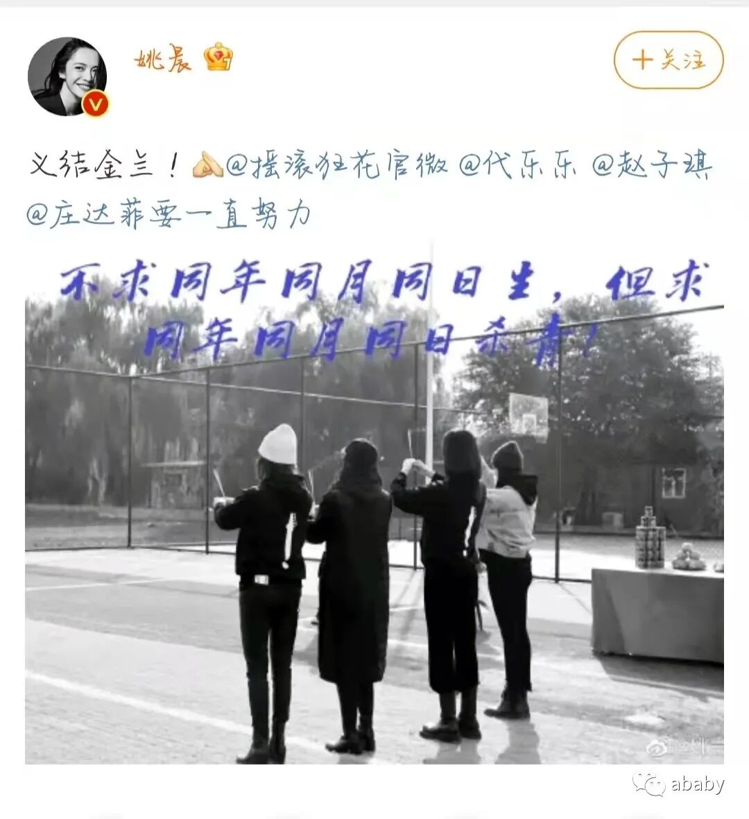 10月28日,演员姚晨在社交平台上发布一张新剧开机的图片,并配文“结义金兰”。