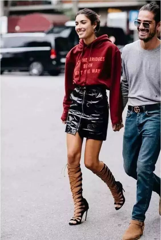 卫衣+皮裙