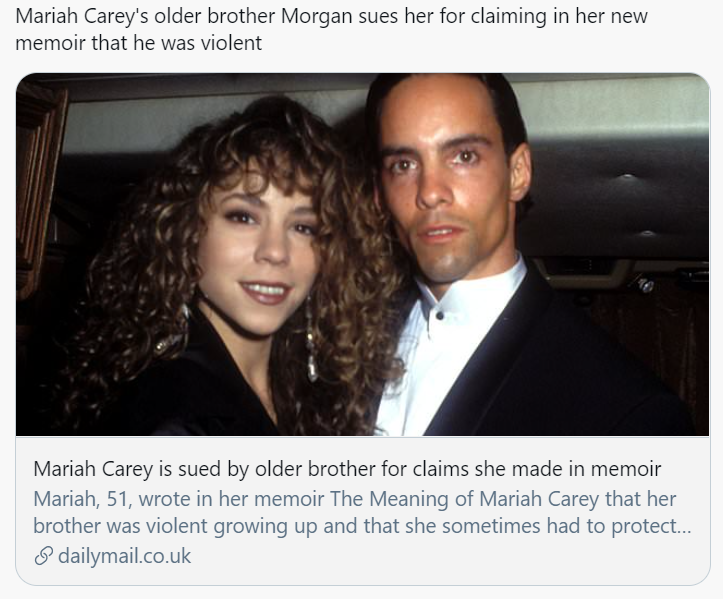 最近,Mariah Carey 的亲哥Morgan Carey 将她告上法庭,控告她在新的回忆录中抹黑自己有暴力倾向,严重影响他的声誉。