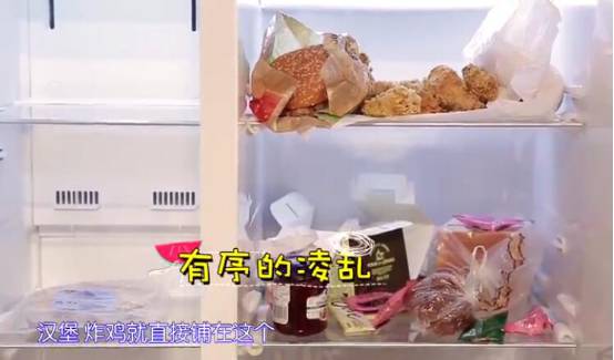 大张伟的冰箱……一看就不是正经冰箱!多余的快餐:汉堡、薯条、炸鸡、撸剩的肉串(何老师说了:撸多了伤身),赤裸的蔬果……如果说,郑恺的冰箱给人一种“遭遗弃”的凄凉,那么,大张伟的冰箱大概就是“不健康”的狂欢。