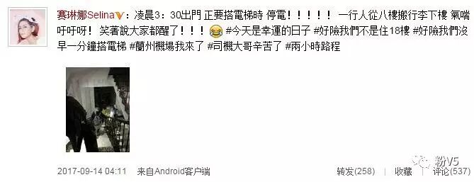 9月14日凌晨Selina发文记录了自己出门遭遇电梯停电的经历:“凌晨3:30出门,正要搭电梯时,停电!一行人从八楼搬行李下楼,气喘吁吁呀!笑着说大家都醒了!”Selina还一并晒出了一行人举着手机照明搬行李的照片,网友心疼不已:“我扛你下楼吧!”