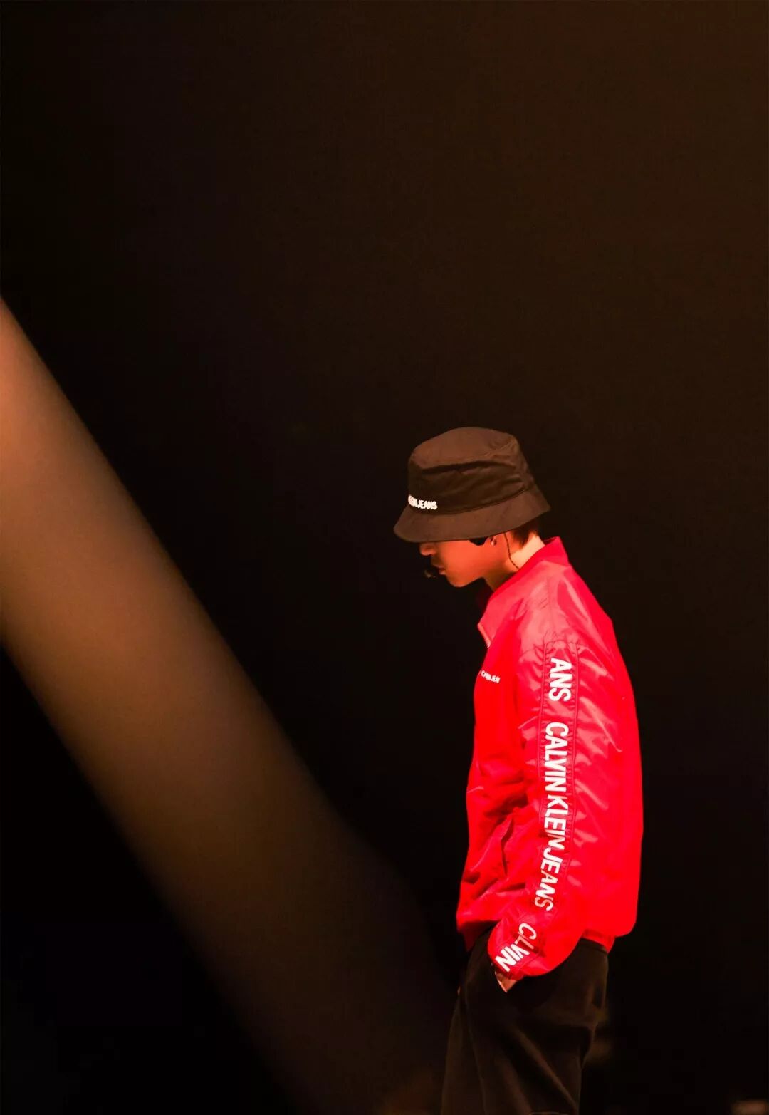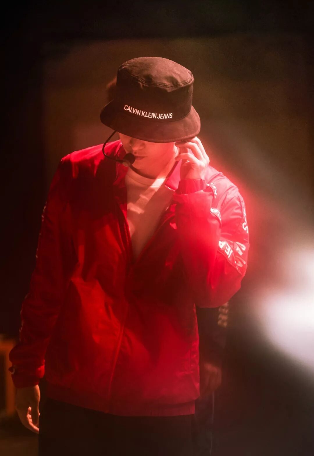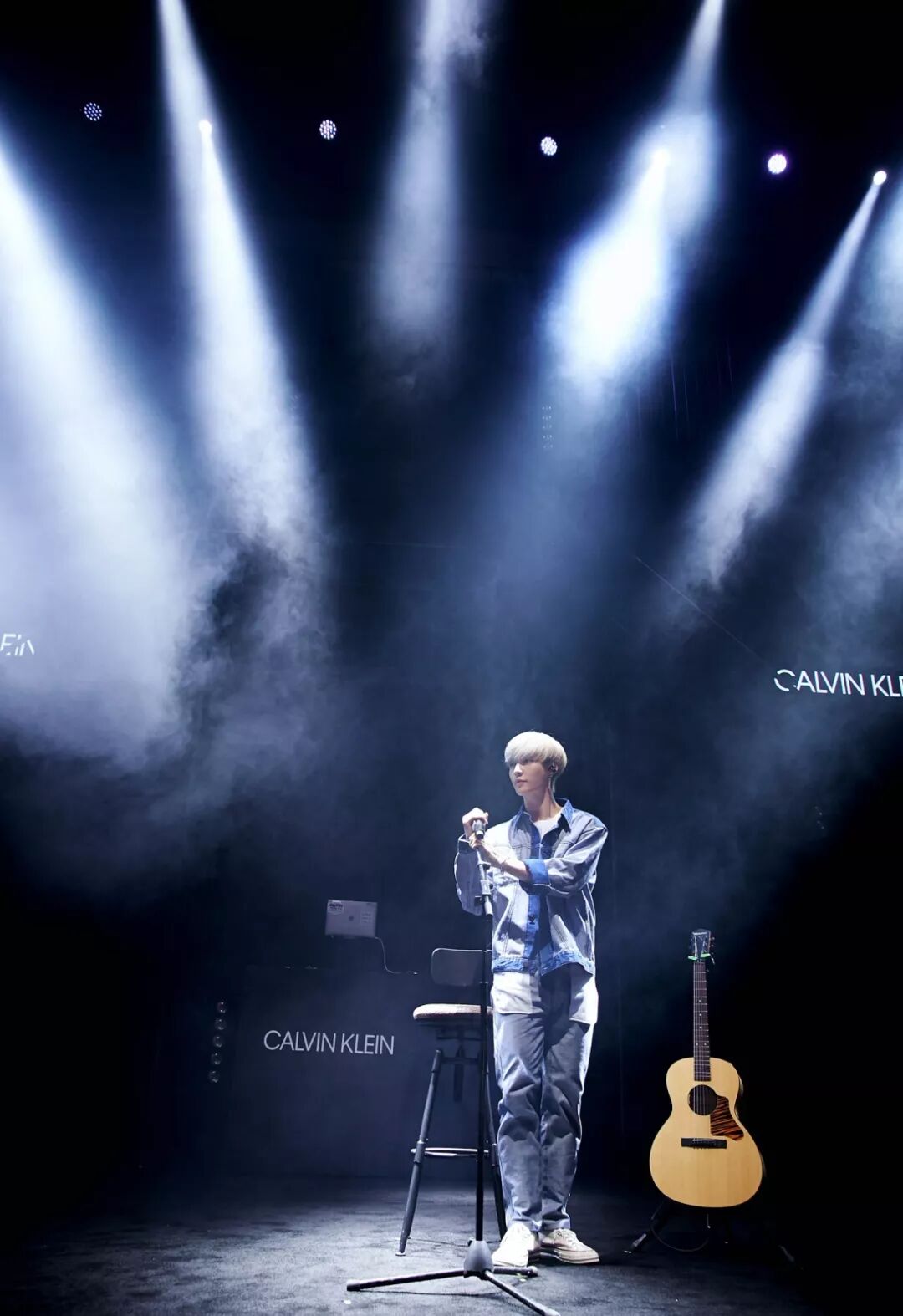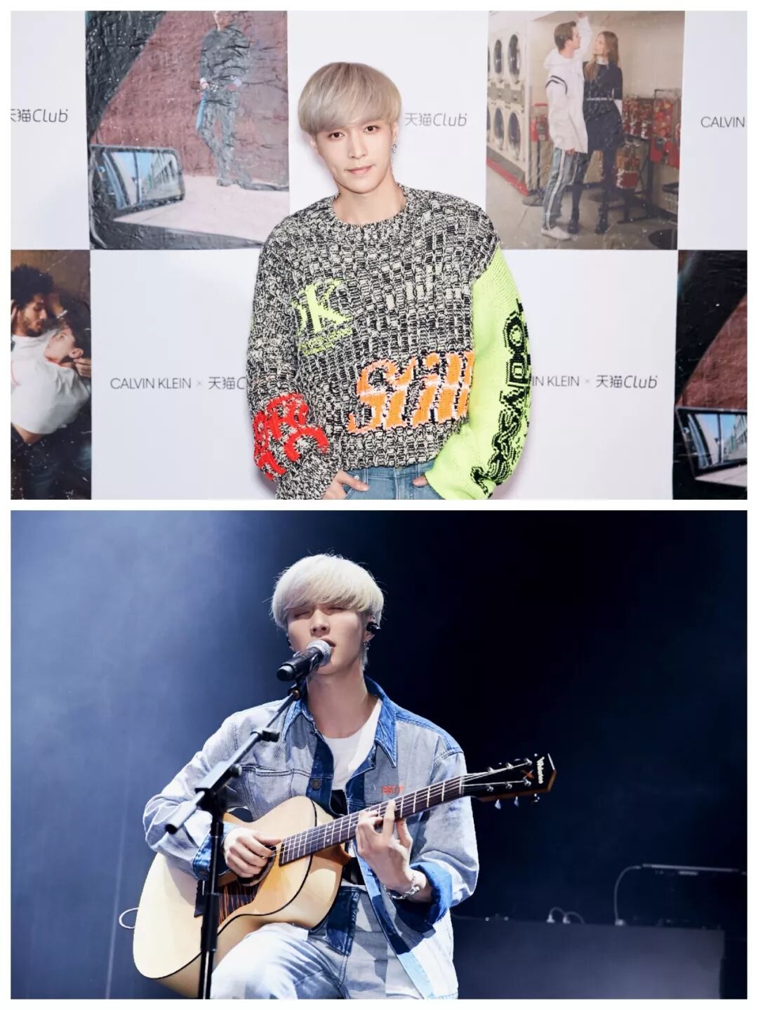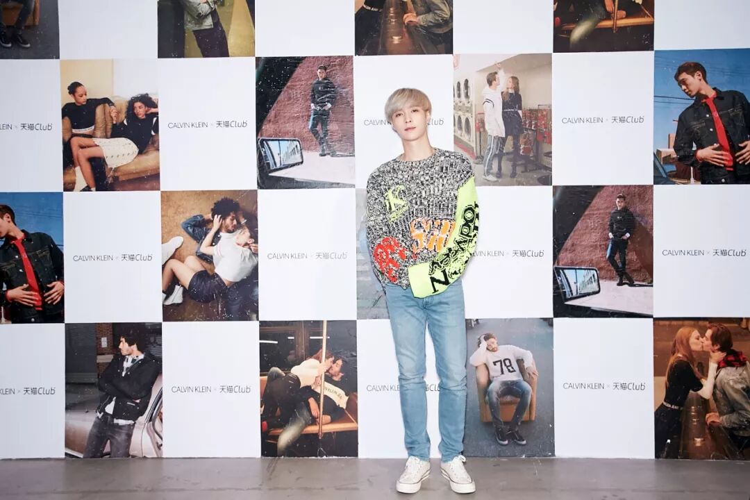 当天他穿了两套衣服,先是涂鸦毛衫,后是牛仔套装,一套鲜丽大胆,一套干净简单,都来自 CALVIN KLEIN JEANS EST.1978 限定系列。