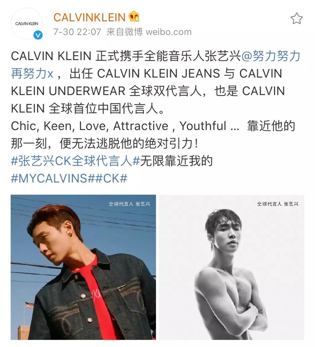 张艺兴加入 CALVIN KLEIN JEANS 与 CALVIN KLEIN UNDERWEAR 全球代言人阵营,大概是七月底时尚圈最轰动的新闻之一。