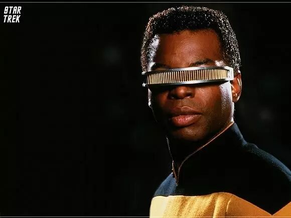 ▲Geordi La Forge天生眼盲,不得不借助于一个特殊的护目镜来看东西,这个护目镜可以看到不同波段的光线,从某种角度来说也成为了他独有的利器。