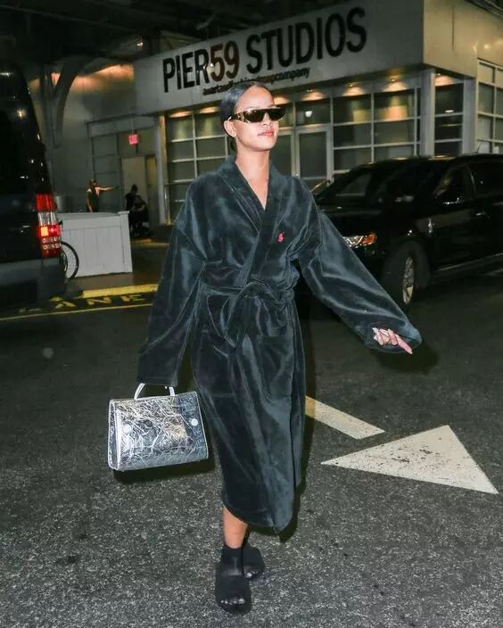 ▼不管休闲装还是浴袍出街,Rihanna镀金版都不离身。