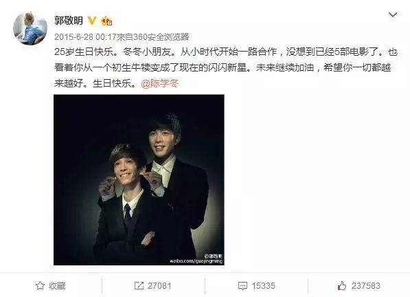要知道去年陈学冬生日当天,郭敬明也是送上了深情的祝福!