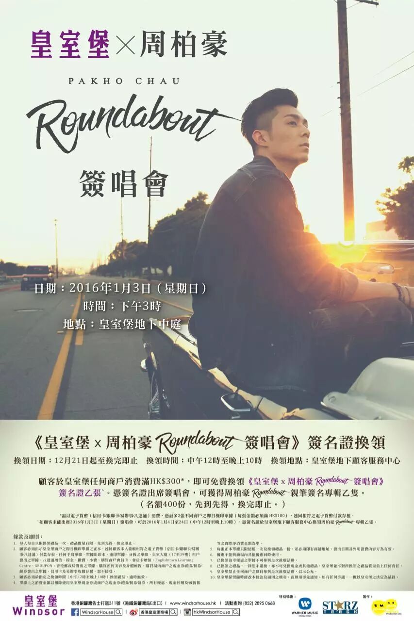 1.顾客于皇室堡任意商户消费满HK$300,即可免费换领《皇室堡X周柏豪Roundabout签唱会》签名证乙张,凭签名证出席签唱会,可获得周柏豪《Roundabout》亲笔签名专辑乙只。(名额限400份,先到先得,换完即止。)