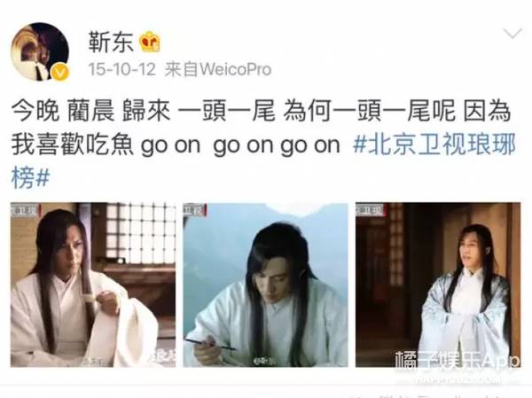 《琅琊榜》播出的时候,靳东在微博上写道“今晚,蔺晨归来,一头一尾,为何一头一尾呢?因为我喜欢吃鱼,go on,go on,go on!”