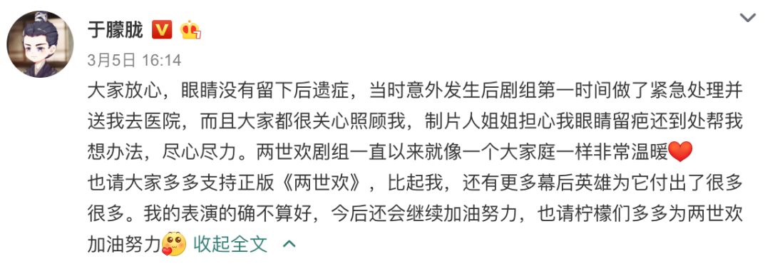 要不是之后有片场视频释出,曝光于朦胧在拍《两世欢》前期眼睛曾遭受严重创伤,观众对他 “演技飘忽”的误会或许就要一直延续下去了。