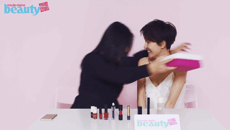 挑出最显白的正红色的口红,亲自帮粉丝涂口红,屏住呼吸小心翼翼的。